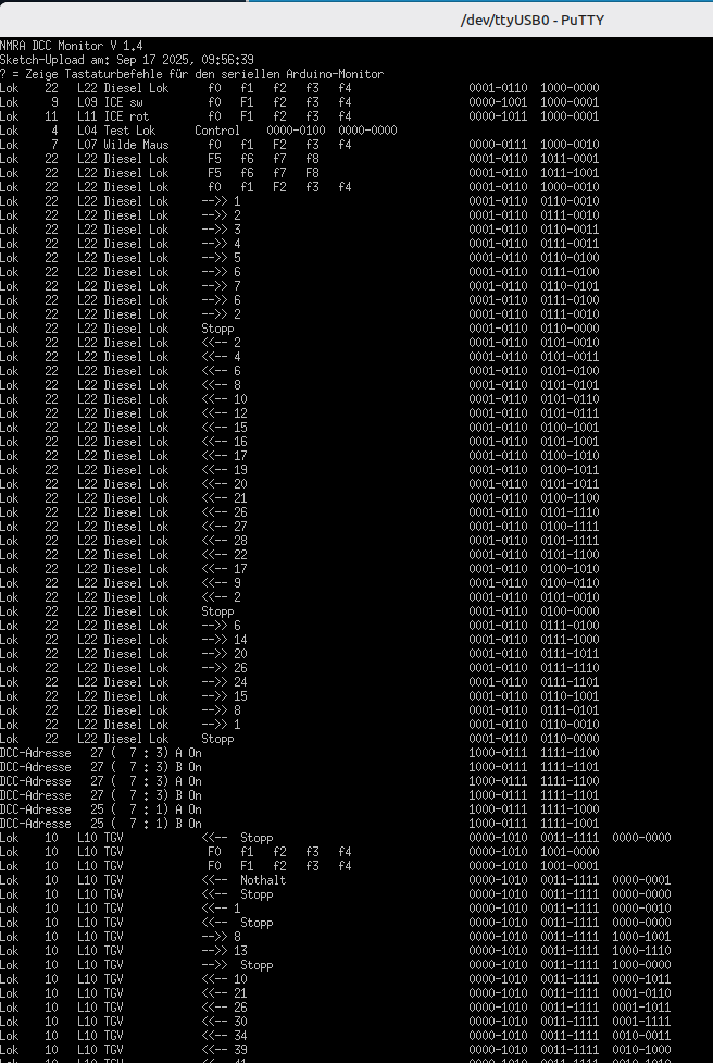 Muster einer Ausgabe am PC mit PuTTY - USB COM 115200 mit "dcc_monitor_v1.4_stummi.ino"